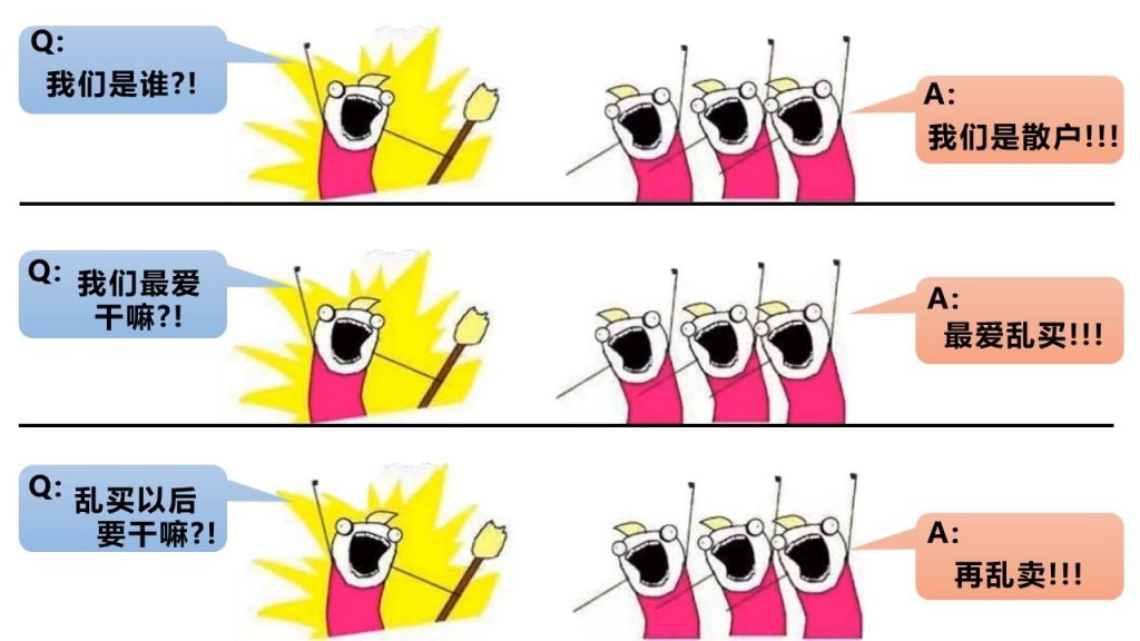 短短幾句簡單對話,卻道出最真實的散戶投資人生,在幽默的背後,有一抹淡淡的悲傷…。大部分的小散因為沒有時間心力學習,總覺得聽現成的專家推薦最快,加上群眾效應,登高一呼就亂買,亂買後又因為恐懼而亂賣,然後就是無止盡的迴圈,繞上個幾百圈也轉不出去。