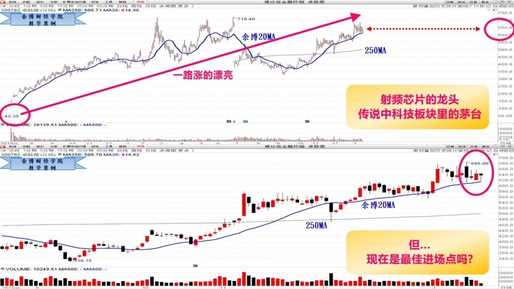 舉例卓盛微來說,它是射頻芯片的龍頭,也算是目前科技板塊裡的茅台,它是不是好股票?是。當年能從40多塊一路長到現在600多,又正值是目前很夯的產業,很多人持續看好。