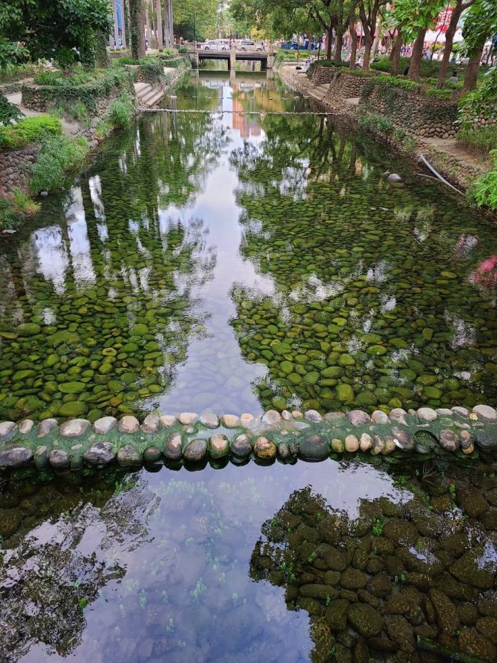 樹木沿著護城河的兩岸排列,河裡還種植許多生態植物,水淺清澈,能看到許多小魚優游。每隔一段距離,打造階梯及舖上石子,讓貪涼的大人小孩可以在此戲水。陽光樹下的微風,徐徐吹起河水上的涼意,我坐在這休憩小歇,好像酷熱感瞬間全消。